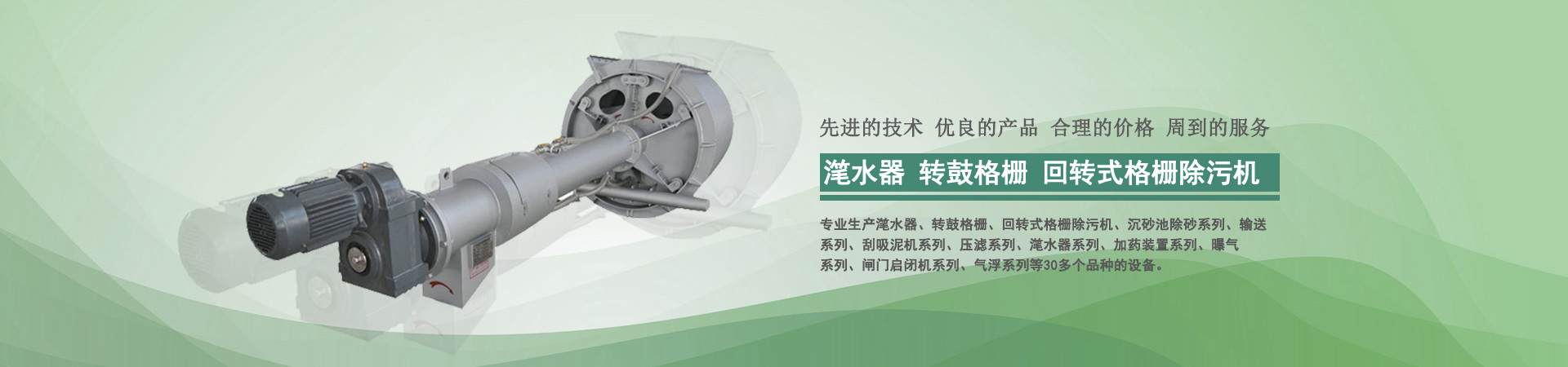 本公司目前专业生产转鼓式精密过滤器、转鼓格栅、回转式格栅除污机、沉砂池除砂系列、输送系列、刮吸泥机系列、压滤系列、滗水器系列、加药装置系列、曝气系列、闸门启闭机系列、气浮系列、曝气器系列、填料系列等30多个品种的设备...
