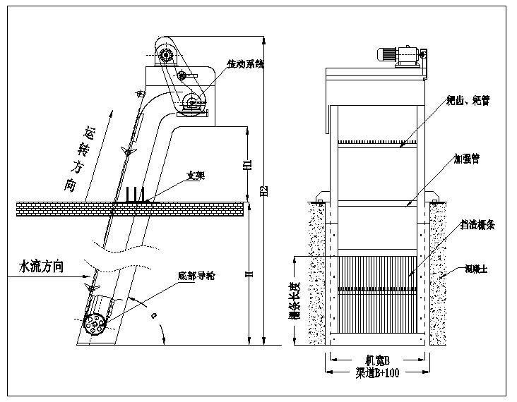 B=機寬; H=渠深; H1=出渣高度; H2=H+H1+2000; α=安裝角度。
